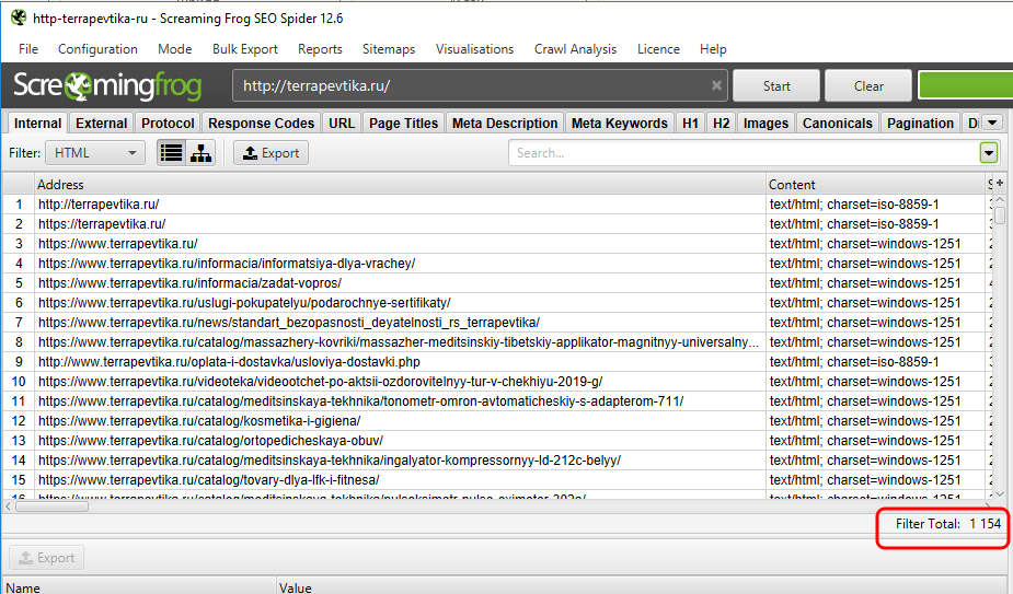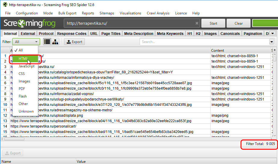 Мы видим, что Screaming Frog SEO Spider у нас отсканировал 9005 элементов. Это много, тем более что в число отсканированных элементов попали картинки, JS-файлы и т.д. Поэтому в фильтре ставим html, чтобы у нас в списке остались только адреса страниц.