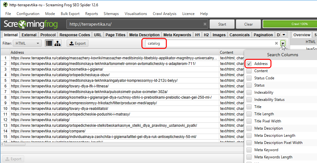 Но и этого многовато, поскольку в списке присутствуют битые ссылки, а также 301 редиректы. Что же делать? Правильно – добавить еще один фильтр, чтобы в списке остались только те страницы, в адресах которых присутствует catalog.