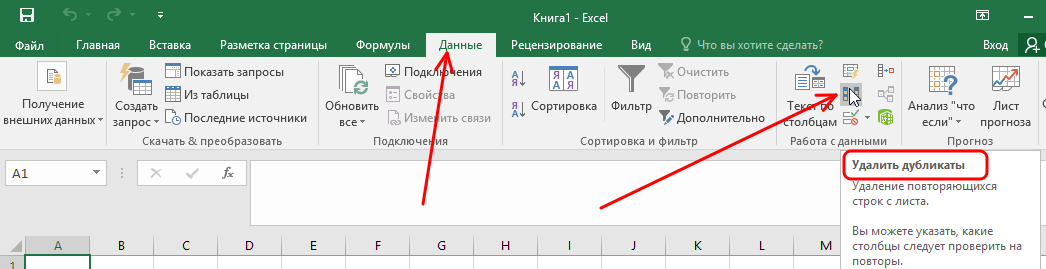 Далее копируем из Screaming Frog’а в Ёксель полный список УРЛов, у которых присутствует catalog. Копировать нужно таким образом, чтобы все УРЛы были в одном столбце, а между двумя списками не было пустых строк. Т.е. фактически мы объединили 2 списка в 1. А вот теперь внимание – выделяем список, переходим на вкладку «Данные» и нажимаем на кнопку «Удалить дубликаты». Первая часть списка (с УРЛами разделов и поразделов) осталась нетронутая, а вот из второй части эти УРЛы были удалены. Теперь вручную удаляем первую часть списка и получаем список УРЛов с карточками товаров.