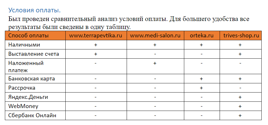 Вот здесь уже отчетливо видно, где клиент уступает конкурентам, а где конкуренты уступают клиенту. На этом моменте многие спросят: «А почему в таблице так мало способов оплаты?». Потому что в таблице перечислено ТОЛЬКО то, что есть у конкурентов или у клиента. Остальные способы оплаты (Qiwi, RBK-Money и т.д.) перечислены В ВЫВОДАХ. И такой подход мы считаем самым правильным, поскольку именно в выводах должна предоставляться информация о том, за счет чего можно обойти ВСЕХ конкурентов.