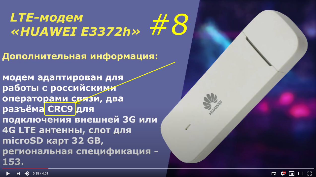 0:35 – ну, собственно, вот и первый косяк – разъемы CRC9 были на E3372s. На E3372h разъемы TS9, которые визуально похожи на CRC9, но отличаются по диаметру, из-за чего их легко перепутать. Т.е. здесь уже идет чистой воды дезинформация зрителей.