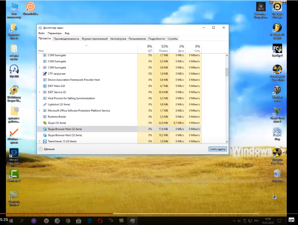 - Skype Browser Host (2 процесса, суммарно около 40 мегабайт), который после снятия задачи один фиг восстановился;