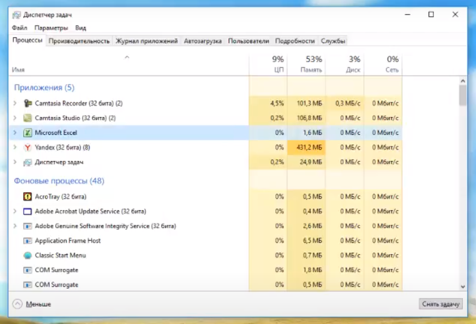 И с первых же кадров – оперативная память загружена на 53-54%, причем Camtasia Studio, с помощью которой автор делает запись с экрана, занимает в районе 210 мб, а Яндекс.Браузер – в районе 430 мб. Более «крупных пожирателей» памяти обнаружено не было.