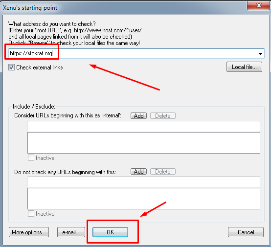 Скачали, установили, запустили, затем «File» — «Check URL» - откроется окошко, в которое потребуется ввести адрес Вашего сайта. Адрес сайта желательно вводить полностью, т.е. с http/https (в зависимости от того, по какому из двух протоколов будет работать сайт), с www (если оно присутствует) и т.д. Это необходимо для того, чтобы в таблицу не попадали лишние редиректы. После ввода адреса необходимо поставить галочку «Check external links» - это необходимо для того, чтобы программа проверила на работоспособность не только внутреннюю перелинковку, но и исходящие ссылки.