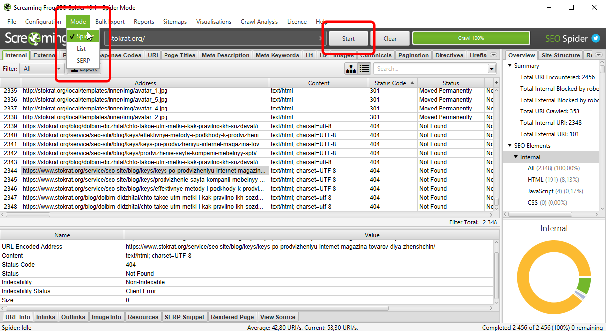 Проверка битых ссылок программой Screaming Frog SEO Spider