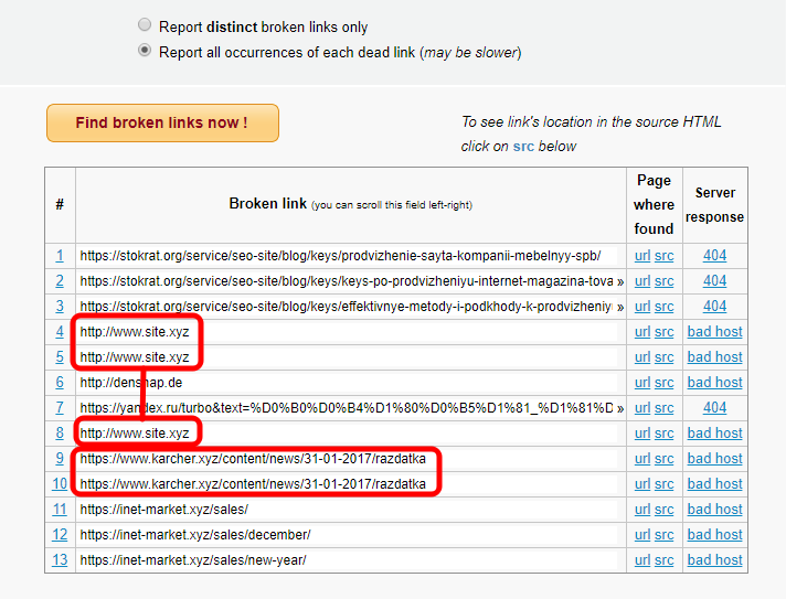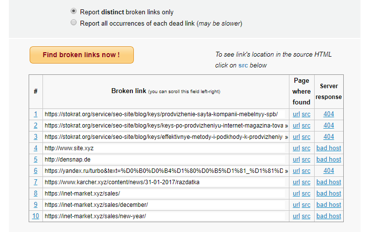 В нижнем положении сервис делает то же самое, но добавляет в список ссылки даже в том случае, если они уже есть. Следовательно, Вы не просто получаете список битых ссылок, но еще и получаете возможность узнать, сколько раз одна и та же ссылка повторяется на сайте.