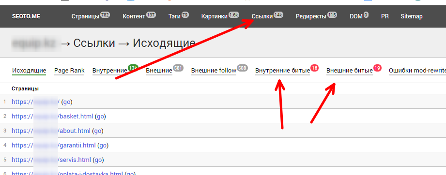 Заходим в проект, выбираем в верхнем меню Ссылки, а далее сами решайте, какие ссылки Вы хотите просмотреть – внутренние или внешние (сервис их разделяет).