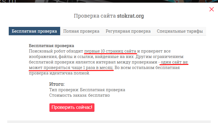 - можно сканировать и в бесплатном режиме, однако, в этом случае 70% информации будет скрыто, если сервис нашел на Вашем сайте 100 битых ссылок, то Вы увидите только 30.
