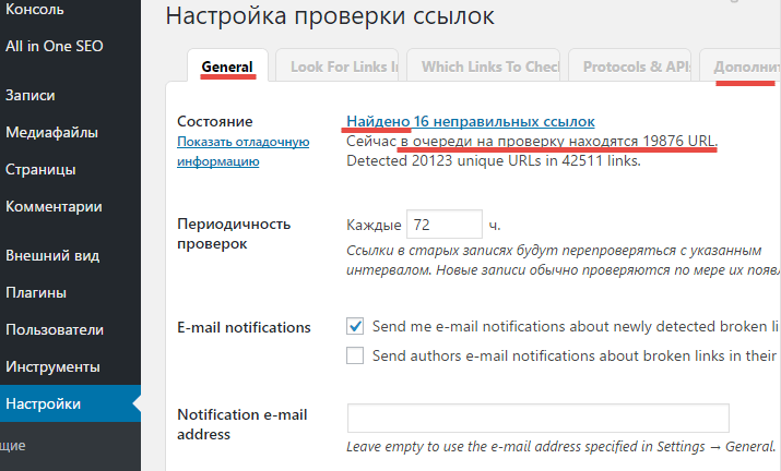 Мы сейчас не будем рассказывать о том, где и как скачать этот плагин, ибо если у Вас WordPress – значит Вы это и так знаете. Итак, скачали, установили, активировали. После этого плагин сразу же начнет сканировать сайт на предмет битья. В любой момент Вы можете зайти в админку, затем в «Настройки» — «Проверка ссылок» и увидеть, сколько битых ссылок плагин уже нашел, сколько объектов уже просканировано, а сколько объектов еще «на очереди».