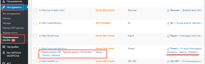 Также стоит отметить, что в правом меню админки (точнее – в меню «Инструменты») появится пункт «Неправильные ссылки». Собственно, именно там и можно будет их либо исправить, либо удалить.