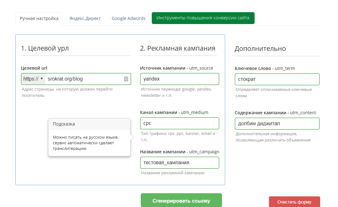 Онлайн-сервис utmurl.ru – имеет 2 режима генерирования ссылок с UTM-метками: ручной, для Google Adwords и для Яндекс.Директ. Естественно, во всех трех случаях адреса будут разные. Также можно прописывать параметры UTM-меток кириллицей, они автоматически будут транслитироваться.