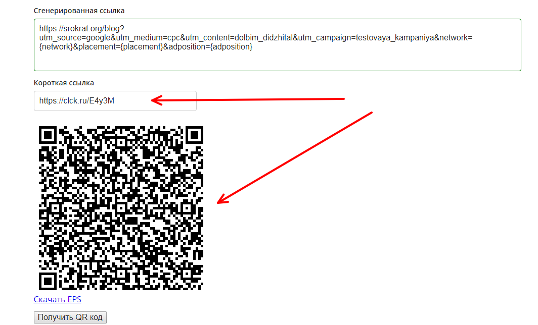 И еще один бонус – Вы получаете не только готовую ссылку с UTM-метками, но и сокращенную ссылку и даже QR-код.