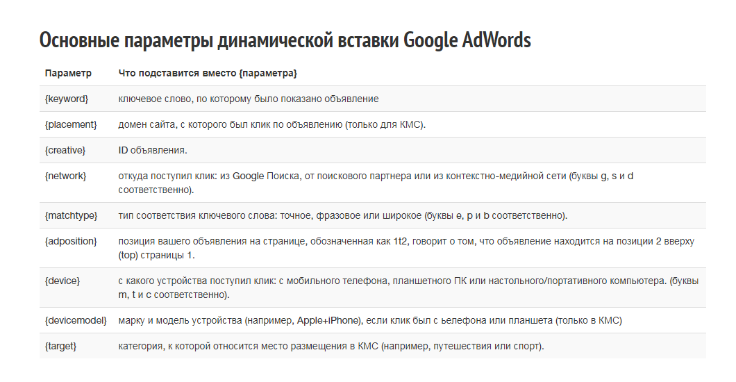 Наиболее часто динамические UTM-переменные применяются в параметре utm_content, но ничто не мешает использовать их и в других метках. Ну а теперь давайте разберемся, какие динамические переменные используют Google Adwords и Яндекс.Директ.