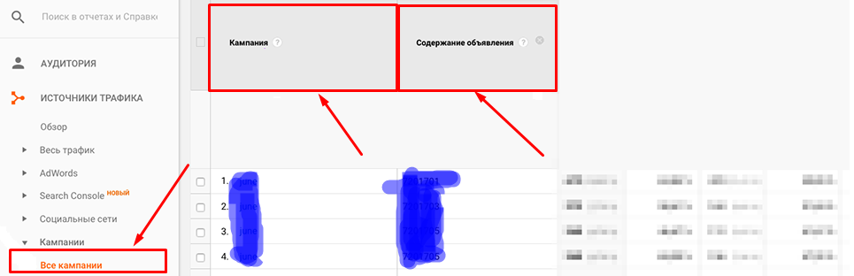 Плюс к этому, можно пройти по «Источники трафика» - «Кампании» - «Все кампании», в качестве дополнительного параметра выбрать «Реклама - Ключевое слово» и «Реклама - Содержание объявления» и получить еще один отчет – по меткам utm_campaign (Кампания), utm_term (Ключевое слово) и utm_content (Содержание объявления).