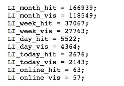 Liveinternet. Данный счетчик в каком-то смысле «попахивает нафталином», ибо его мегапопулярность приходилась примерно на середину «нулевых», но сейчас по ряду причин он такой популярностью уже не пользуется. Однако, можно смело сказать, что если Вы нашли сайт с LiveInternet-счетчиком, то Вам крупно повезло, поскольку всю необходимую информацию (если она общедоступна) можно получить как в цифрах, так и в графиках. Если же статистика закрыта – то только в цифрах, причем через сторонний сервис - http://counter.yadro.ru/values?site=yousite.com, заменив в адресе yousite.com на имя Вашего домена. На выходе Вы получите вот такие данные:
