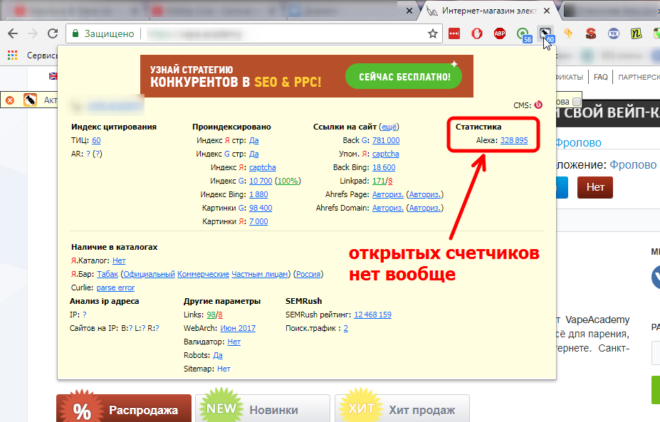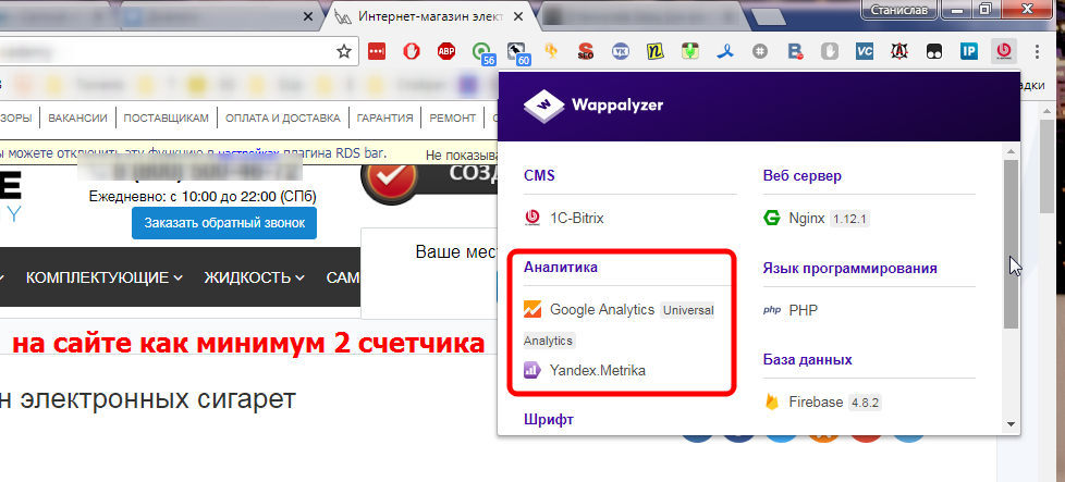 Wappalyzer – главное его отличие состоит в том, что он покажет все счетчики вне зависимости от того, открытая у них статистика или закрытая. В данном случае было обнаружено целых 2 счетчика.