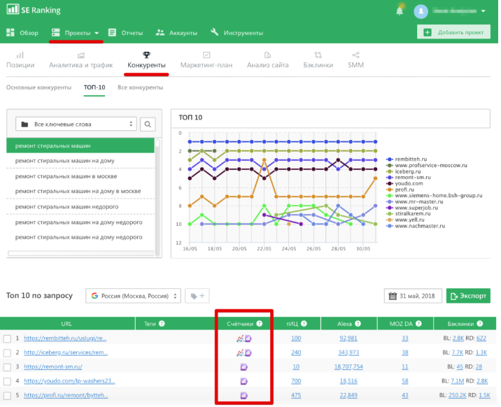 Еще одним мощным помощником для Вас будет сервис SE Ranking – он тоже покажет, какие счетчики на каких сайтах установлены. Для этого открываем модуль «Проекты», переходим на вкладку «Конкуренты». На выходе Вы получите таблицу сайтов, бьющихся между собой за выход в ТОП-10, причем все они будут продвигаться именно по Вашим ключам. Плюс Вы увидите еще одну таблицу – вот в ней-то как раз и будет информация о наличии на сайте счетчиков LiveInternet или Яндекс.Метрики.