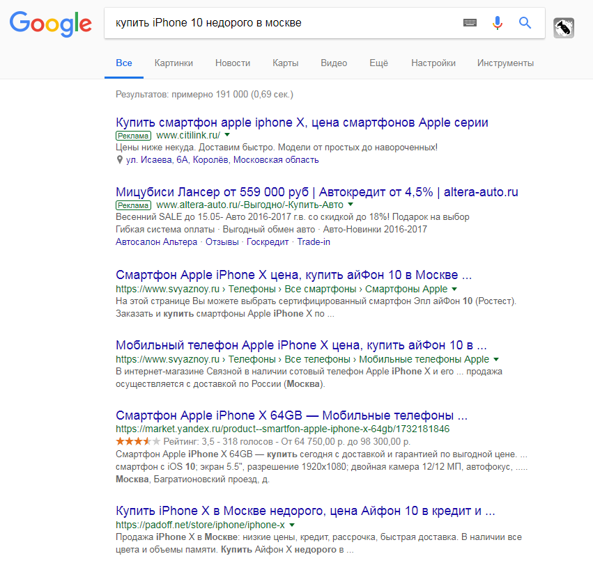Ответ прост – поиск в помощь. Т.е. вводим интересующий запрос в поисковую систему и смотрим поисковую выдачу. В данном случае по запросу «купить телефон» вылезли исключительно предложения по продаже, т.е. запрос явно коммерческий.