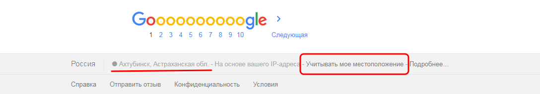 Если коротко, то тут процедура в точности такая же, как и в случае с Яндексом, за исключением одного момента. Google чуть более хитрая поисковая система – на странице поисковой выдачи отключение учета местоположения находится в самом низу страницы.