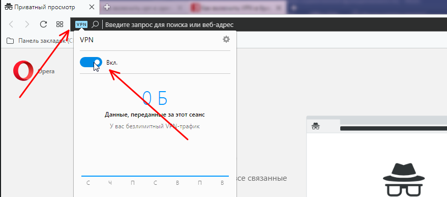 А для большей достоверности можно включить VPN. К слову, в браузере Opera включение VPN является штатной функцией, но доступна она только в инкогнито режиме. Включается она следующим образом:
