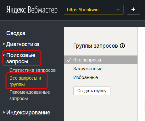 Заходим в Яндекс.Вебмастер, регистрируемся/логинимся, добавляем свой сайт в сервис. Теперь нужно зайти в раздел Поисковые запросы — Все запросы и группы (см. скриншот).