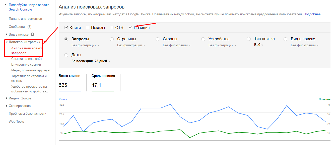 В Google Search Console мониторинг позиций производится практически по той же схеме, только с чуть более обширным функционалом: