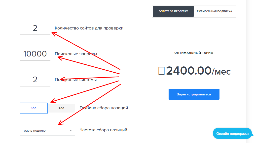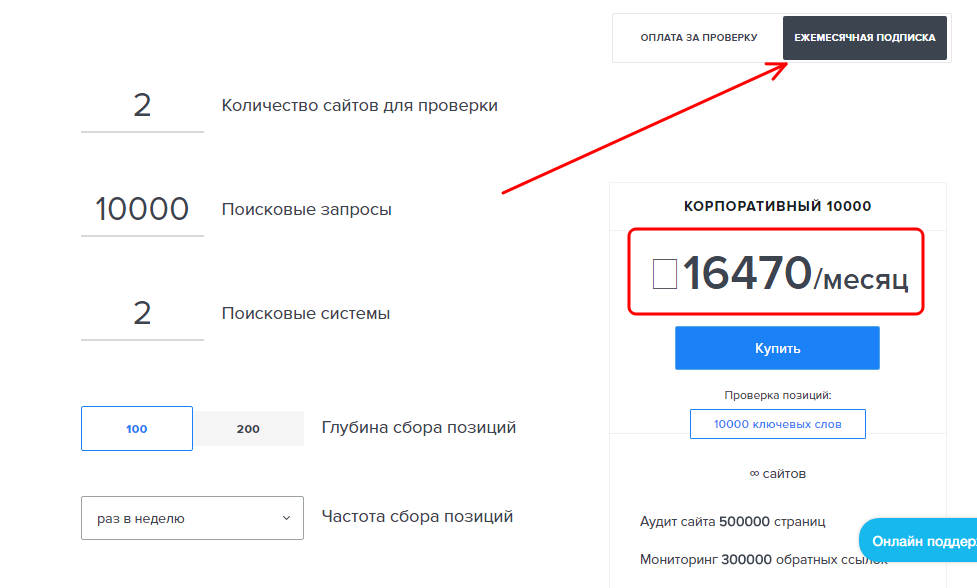 Есть 2 варианта оплаты – «Ежемесячная подписка» и «Оплата за проверку». На странице https://seranking.ru/oplata-za-proverku.html внизу есть онлайн-калькулятор, с помощью которого Вы можете прикинуть, что Вам будет дешевле – платить за каждую проверку, либо оформлять ежемесячную подписку. И сразу же конкретные цифры: