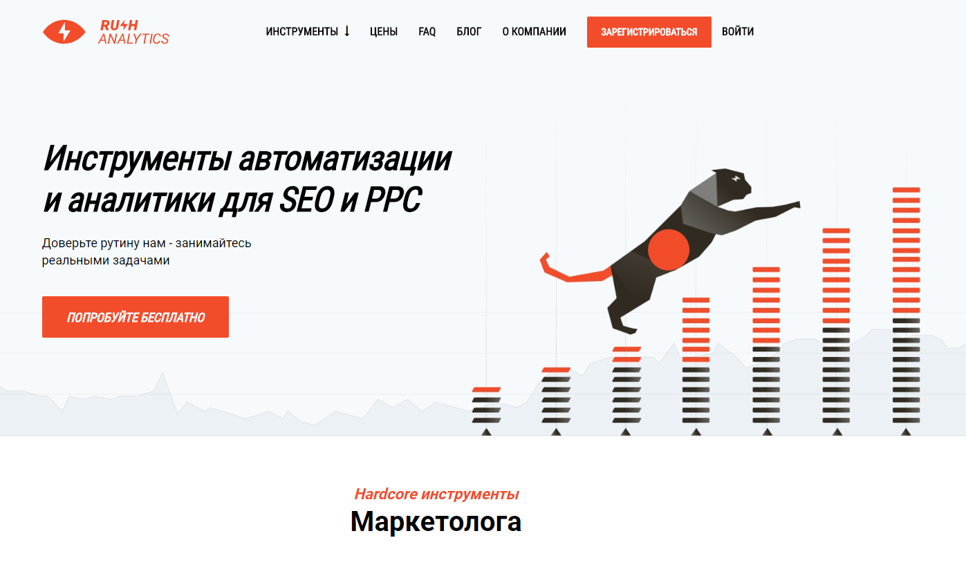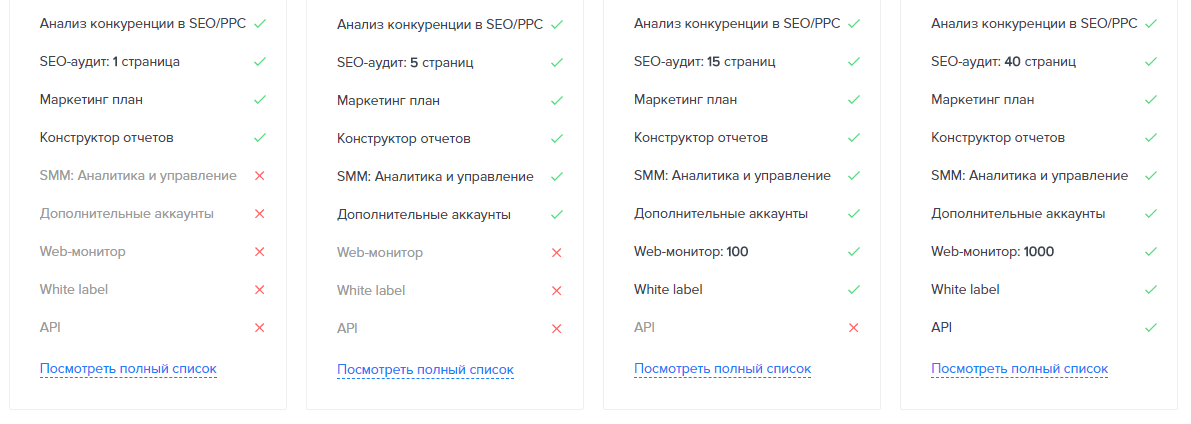 Данный сервис в основном заточен под анализ конкурентов. Однако, вместе с этим присутствуют инструменты для SMM, проверки ранжирования сайта, работы со ссылками, и даже аудита сайта. Протестировать сервис можно за 1$, однако “постоянные» подписки уже идут от 70 до 1000 американских президентов в месяц. (в переводе на рубли – от 4400 до 62000 рублей).