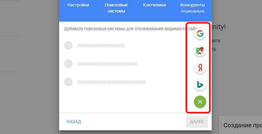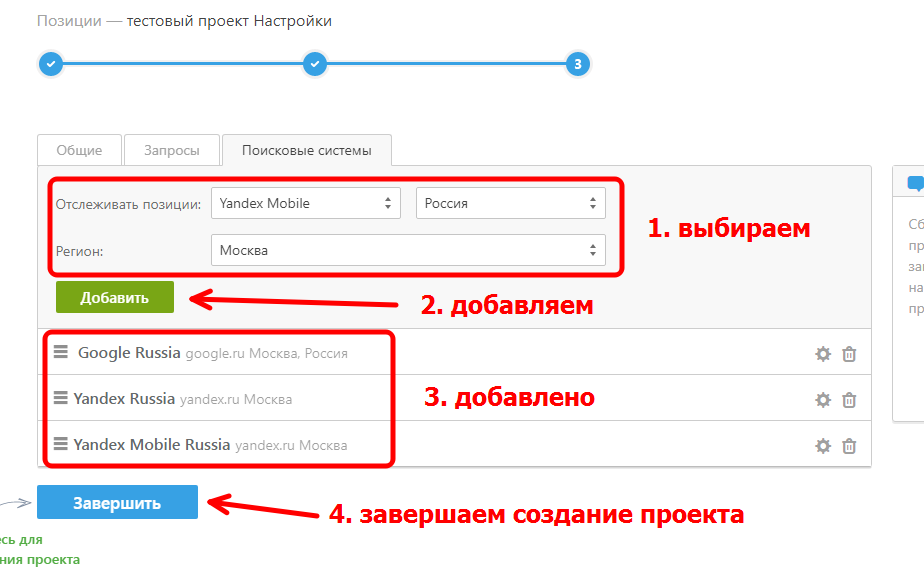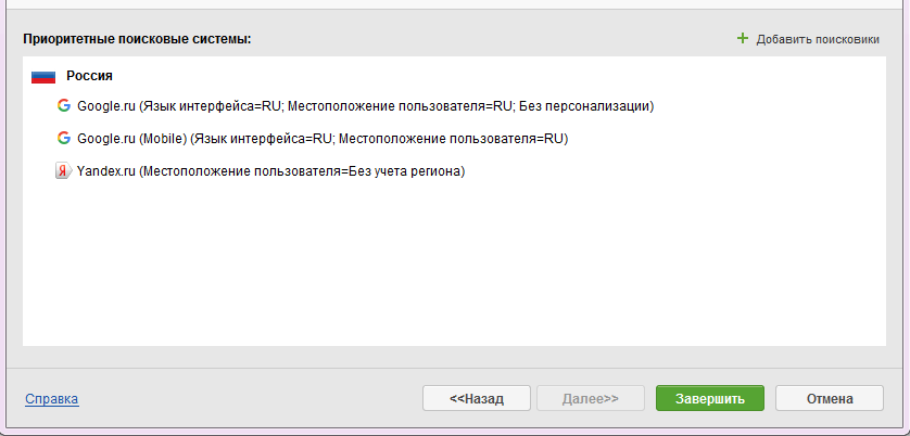 На четвертом шаге указываем поисковые системы. По умолчанию указаны Google, Bing и Yahoo, причем для США.