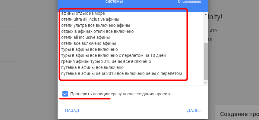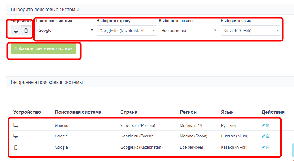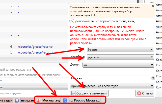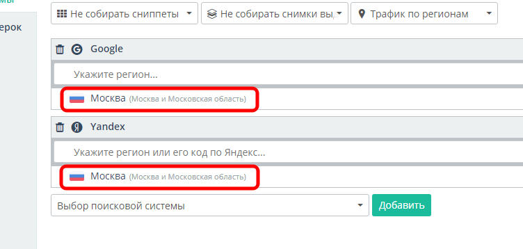 Затем в самом низу необходимо выбрать регионы, по которым будут пробиваться позиции сайта.