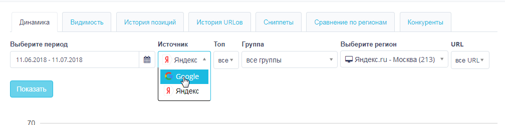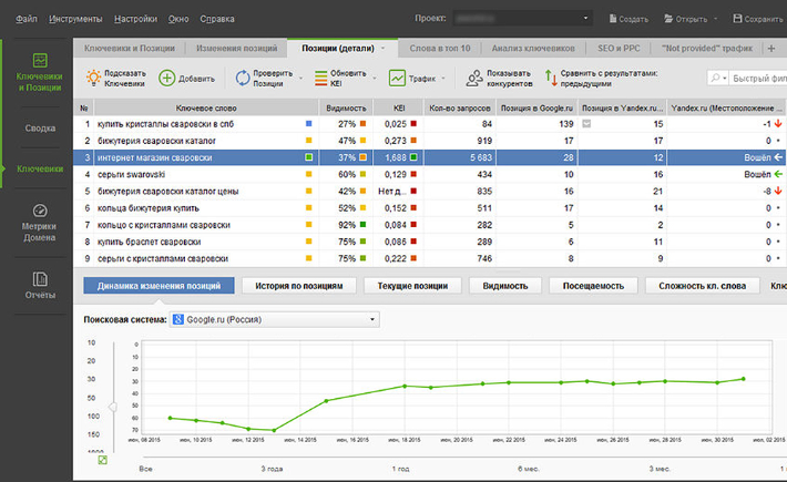 В-шестых, значительно облегчается мониторинг динамики позиций и видимости сайта в поисковых системах, ибо сервисы ее предлагают как в виде графиков, так и в виде таблиц.