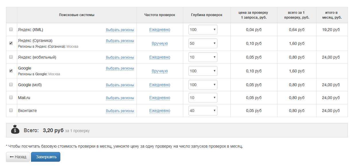для двух сайтов, семантические ядра которых в сумме составляют 10000 ключей, еженедельная проверка позиций в двух поисковых системах с глубиной парсинга на 100 позиций (т.е. если сайт ниже сотой позиции, то считается, что позиции у сайта как бы нет) будет равна 2400 рублей в месяц.