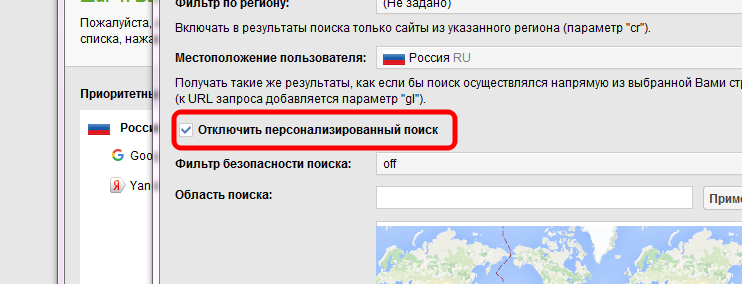Кстати, перед добавлением Google необходимо поставить вот эту галочку - «Отключить персонализированный поиск».