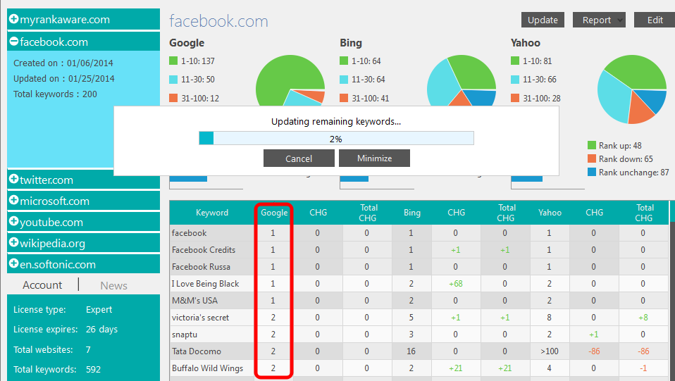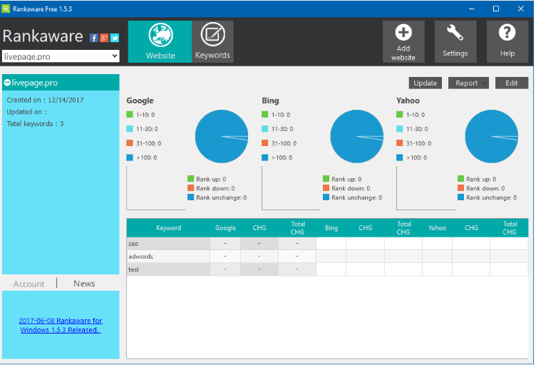 Rankware – это бесплатная англоязычная программа. Точнее – условно бесплатная (т.е. в бесплатном режиме она имеет ограниченный функционал, а в платном – полный). Платная лицензия стоит 60$, т.е. примерно 3700р. Основной минус программы (речь о бесплатной версии) заключается в том, что позиции можно снимать только по одному сайту.