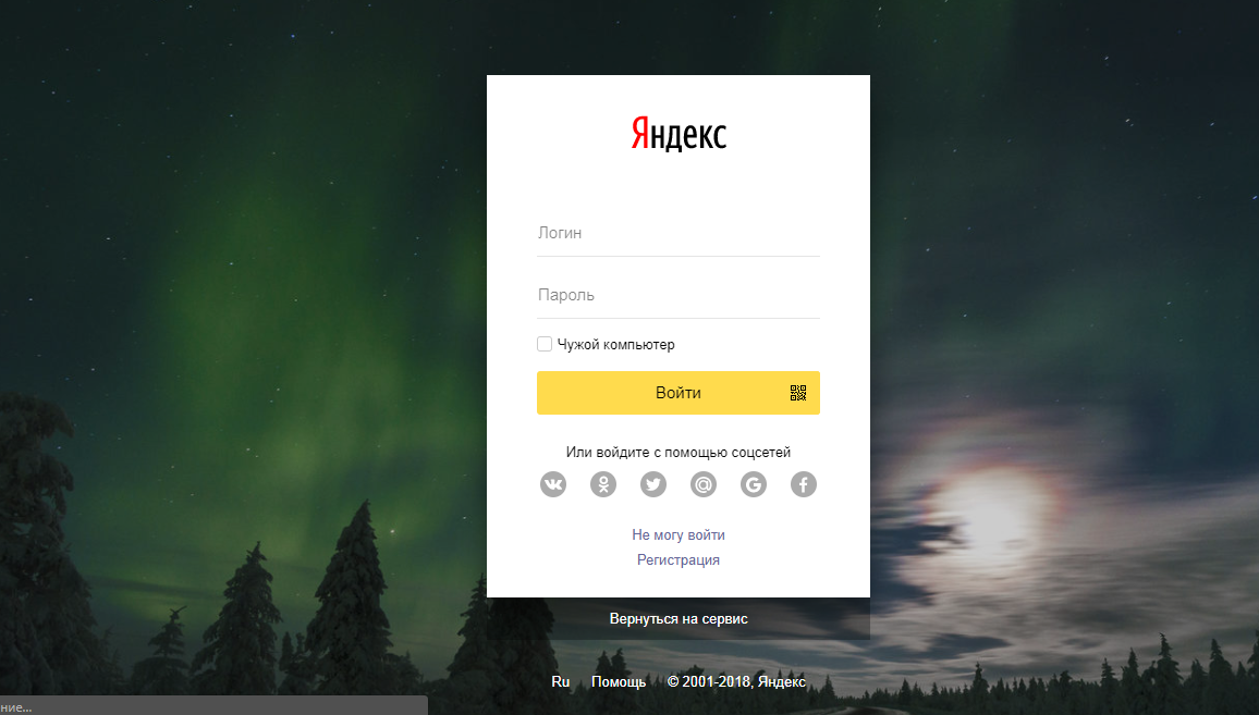 После этого система предложит Вам ввести свои логин - пароль для входа в аккаунт Яндекса. Если аккаунта нет – можно авторизоваться через социальные сети.