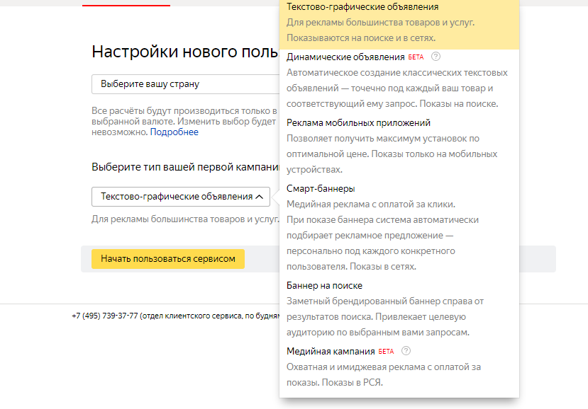 Итак, Вы залогинились. Теперь система перебрасывает Вас в окно настроек пользователя. Здесь требуется указать регион, а также выбрать один из трех типов рекламных кампаний.