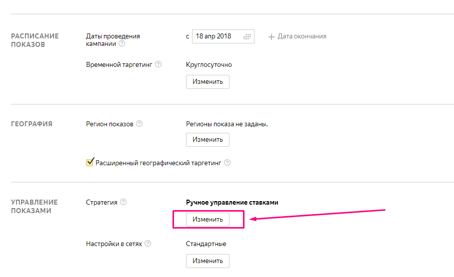 Заходим в «Управление показами» – «Стратегия» затем нажимаем кнопку «Изменить».