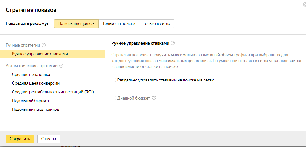 Выбор стратегии – это один из важнейших пунктов настройки. Необходимо понимать, что реклама в сетях – это одно, а реклама на страницах с поисковой выдачей – совсем другое. Именно поэтому эти кампании нужно разделять. Если этого не сделать – эффект будет минимизирован.