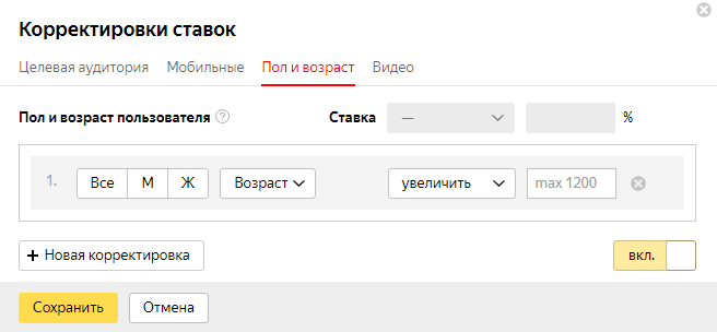 Заходим в «Корректировку ставок» - «Пол и возраст» - «Новая корректировка». В таблицу будет добавлена новая строка. В ней выбираем пол (в данном случае – женский), возраст – «любой» (в данном примере у нас нет никаких возрастных ограничений), увеличиваем значение на сколько-то там процентов (например, на 70) и жмем «Сохранить», чтобы изменения вступили в силу.