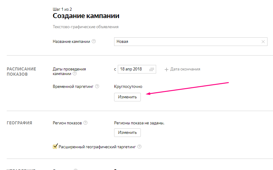 Когда нужно показывать объявления? Днем, когда все на работе? Утром, когда все еще спят? Или ночью, когда все смотрят телевизор? Разумеется, для каждой рекламной кампании правильный ответ будет своим. Поэтому переходим к настройке временных рамок, в пределах которых будет отображаться объявление. Для этих целей в Директе есть «Временной таргетинг». По умолчанию выставляется настройка «Круглосуточно». В большинстве случаев этого не требуется, поэтому нажимаем «Изменить».