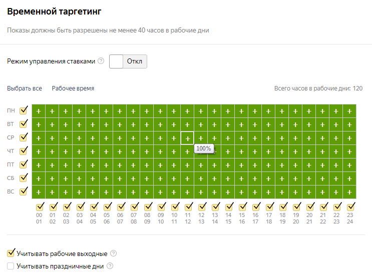 Для того чтобы понять, как настраивается временной таргетинг, достаточно просто взглянуть на приведенный ниже скриншот.