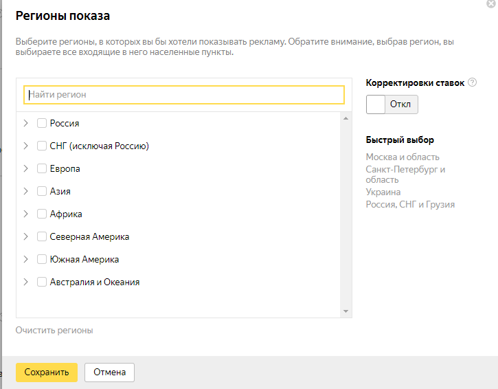Настройка региона – это ультраважнейший параметр. Ни в коем случае не следует устанавливать в качестве региона всю страну – это приведет к тому, что пользователи всей страны будут кликать на Ваши объявления, а затем уходить с сайта со словами «тьфу ты, а я думал это у нас, а это вообще на другом конце страны». Слив бюджета гарантирован на все 100%. Даже столь мощные торговые сети, как М-Видео, Эльдорадо, Ситилинк, и т.д., не устанавливают в качестве региона всю страну, т.к. даже для них это будет серьезным ударом по карману.