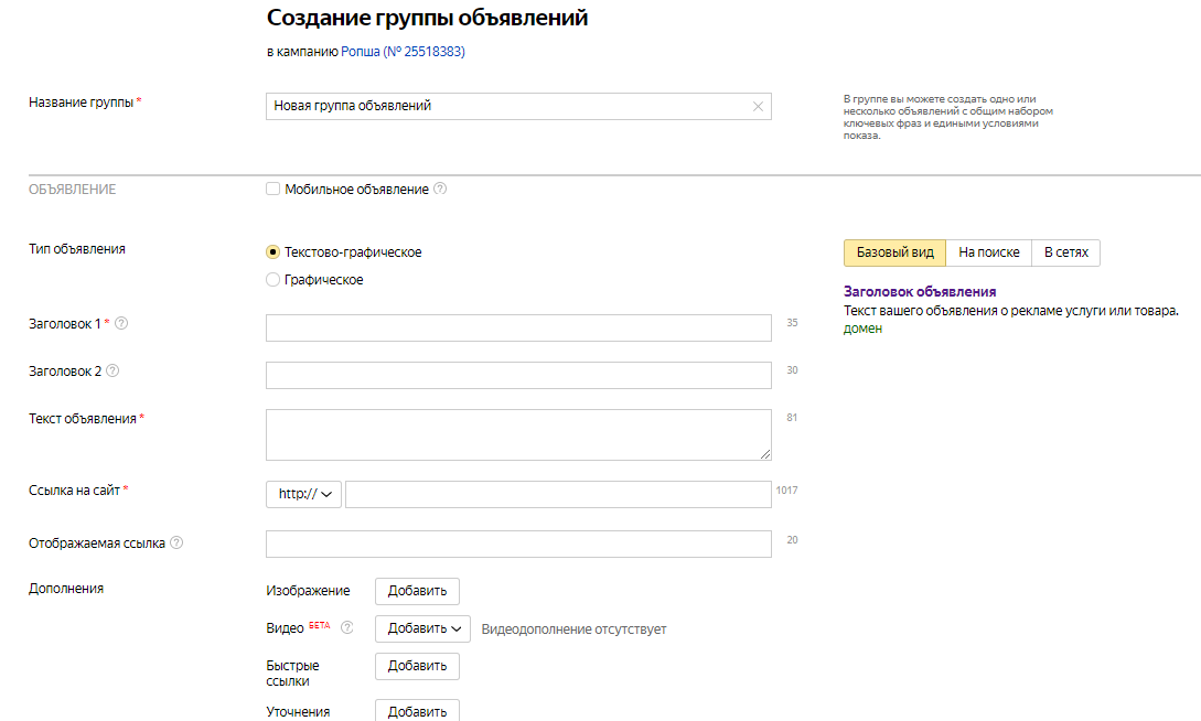 Шаг №2: создаем группу объявлений в Яндекс Директ