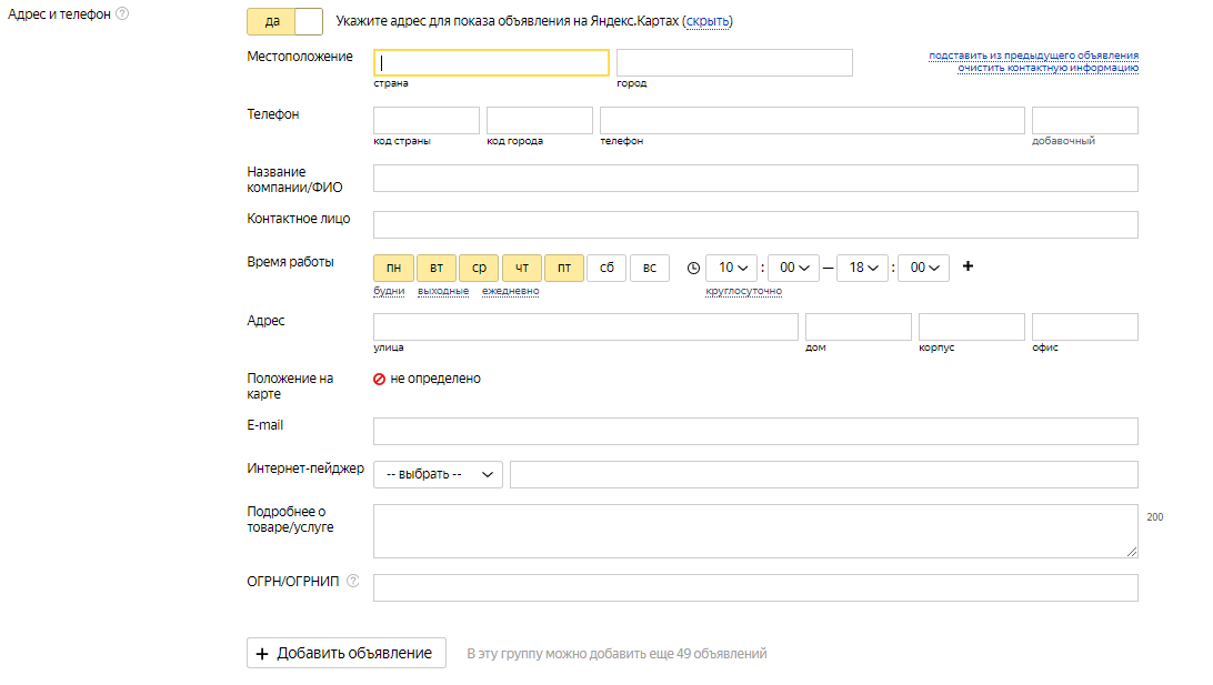 Раздел «Адрес и телефон» должны быть заполнены в обязательном порядке, чтобы пользователи могли не только перейти на сайт, но и позвонить Вам. Плюс это повысит уровень доверия к объявлению, что тоже повлияет на CTR.