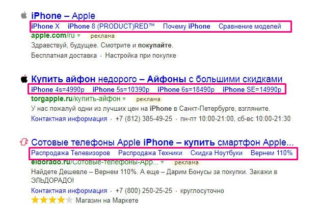 Начнем с быстрых ссылок. Они необходимы для того, чтобы облегчить пользователю ориентирование. Например, Вы продаете восьмой iPhone, который продается в нескольких цветах – белый, серебристый, черный и розовый. В качестве основной ссылки можно указать адрес раздела, в котором эти айфоны хранятся – пусть дальше сам выбирает. Можно поступить еще проще – указать 4 дополнительные ссылки (по одной на каждый цвет), т.е. пользователь уже выберет сразу тот цвет, который ему нужен. Такой ход позволяет значительно повысить CTR объявления, т.к. вместо одной ссылки пользователю на выбор предоставляется целых 5. Плюс приятный бонус – такое объявление куда сильнее бросается в глаза, чем объявление без быстрых ссылок. Но есть и минус – общая длина быстрых ссылок не должна превышать 66 знаков.