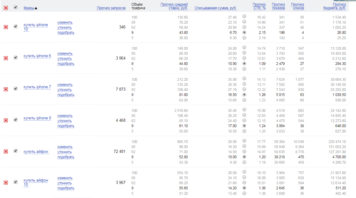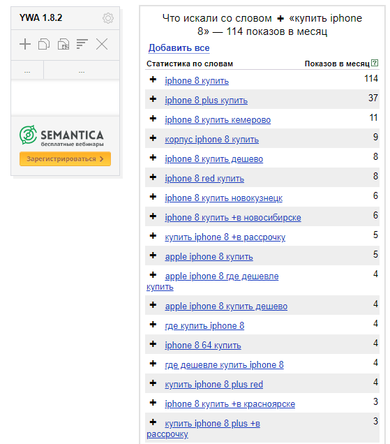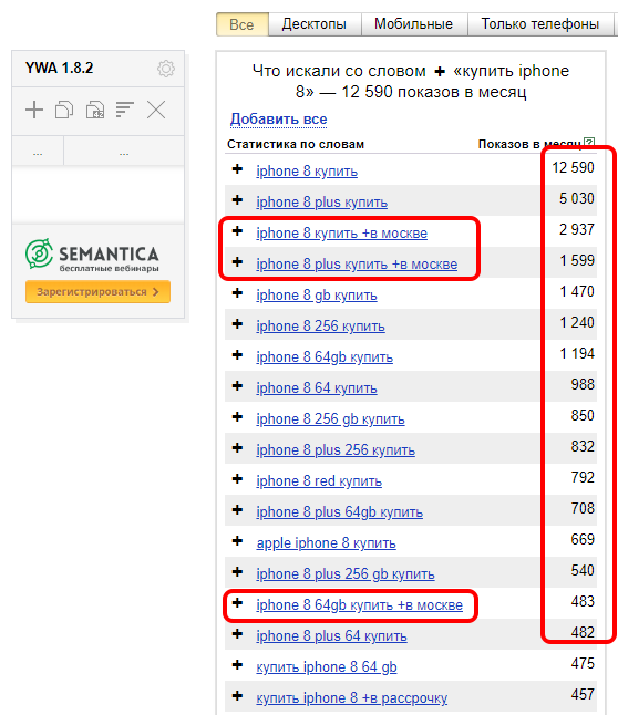 Однако, в обоих случаях нужно собрать самые популярные запросы. Для этого добавляете их в список с помощью плюсиков, а затем копируете весь список целиком и вставляете, например, в Excel-файл. Обратите внимание, что iPhone 8 и iPhone 8 Plus – это две разные модели, поэтому под них необходимо делать 2 разных объявления. Следовательно, для них нужно собирать 2 разных списка.