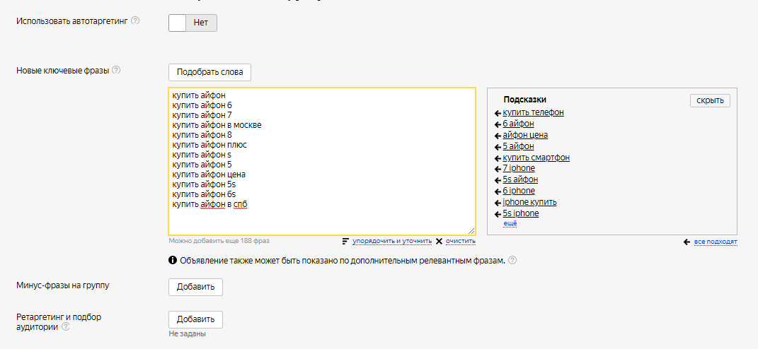 Еще раз про минус-фразы. Обратите внимание, что ключ «iPhone 8» является частью ключа «iPhone 8 Plus». Соответственно, нам важно, чтобы по ключу «iPhone 8 Plus» пользователь НЕ видел объявление про iPhone 8, т.к. это две разные модели. Поэтому для объявления про iPhone 8 необходимо добавить слово Plus в список минус-фраз.