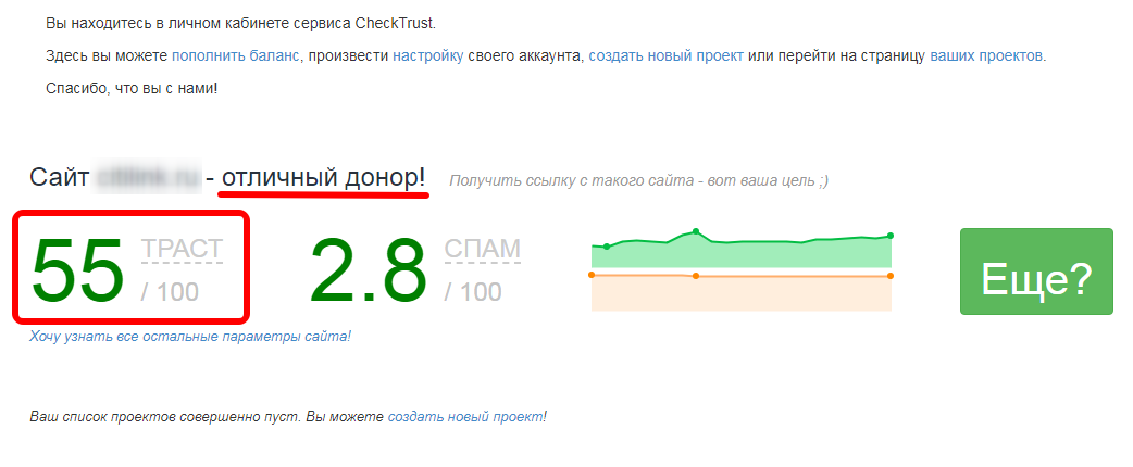 Проверить траст сайта можно на сайте https://checktrust.ru/, там он оценивается по 100-бальной шкале. Показатель траста должен быть не менее 30. Выглядит это примерно вот так:
