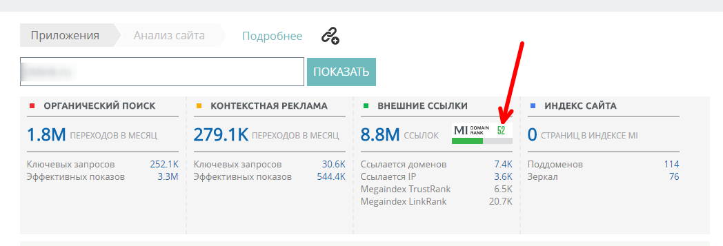 Ранее уже упоминался. Позволяет оценить траст сайта и качество внешних ссылок. |