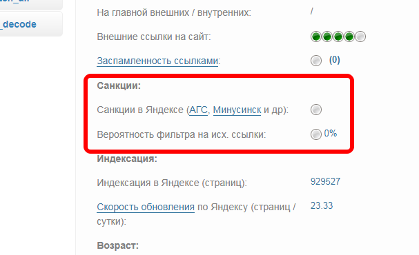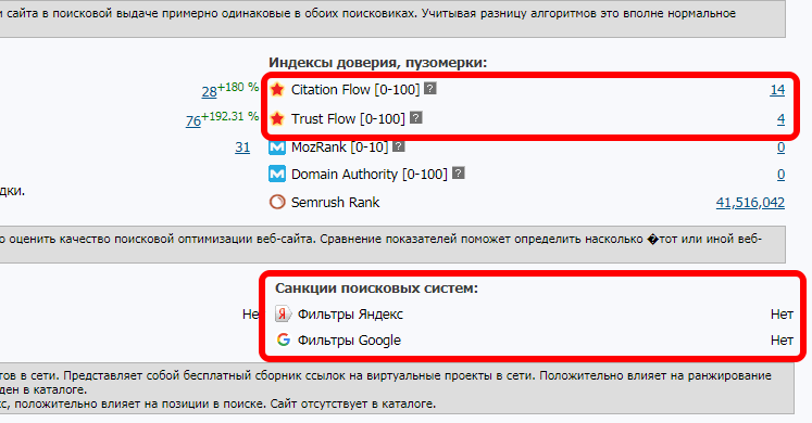 Здесь же можно подсмотреть, наложены ли на сайт какие-либо санкции со стороны поисковых систем. В данном случае цитируемость = 14, траст = 4, санкции со стороны поисковых систем не обнаружены: